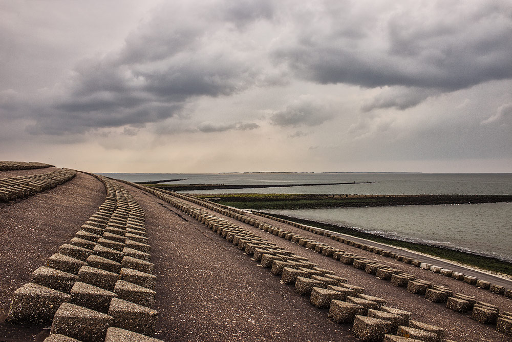 Dunkle Wolken ziehen über das Westdeckwerk hinweg. Am Horizont ist die Ostplate der Nachbarinsel Spiekeroog auszumachen.