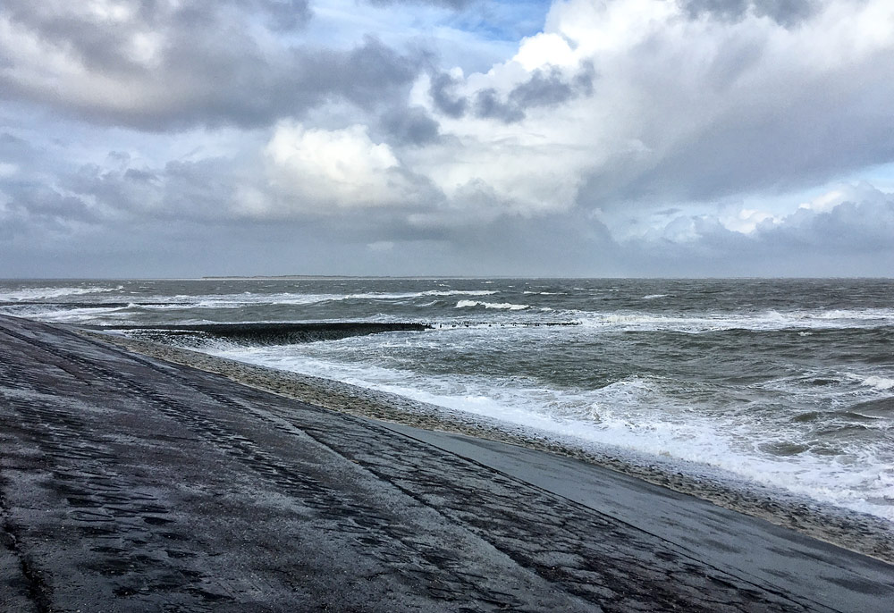 Ganz schön herbstlich! Der Wasserstand ist allerdings recht niedrig, so daß dem Deckwerk, das 2018 erneuert wird und dem bereits heute die Wellenbrecher fehlen, keine Gefahr droht.
