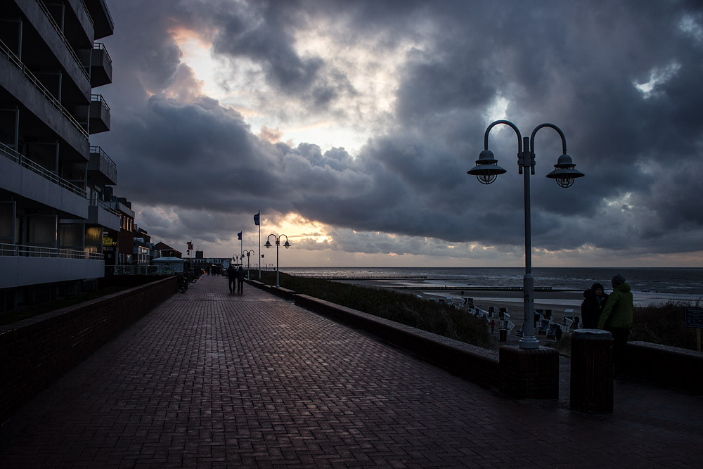 Es wird Abend. Wir sind noch einmal zur Strandpromenade gelaufen und blicken an den Strand.