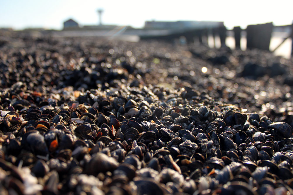 Dicht an dicht wie auf einer Muschelbank wachsen die Miesmuscheln auf den Seebuhnen, in diesem Falle der Buhne »M« nördlich der Signalstation.