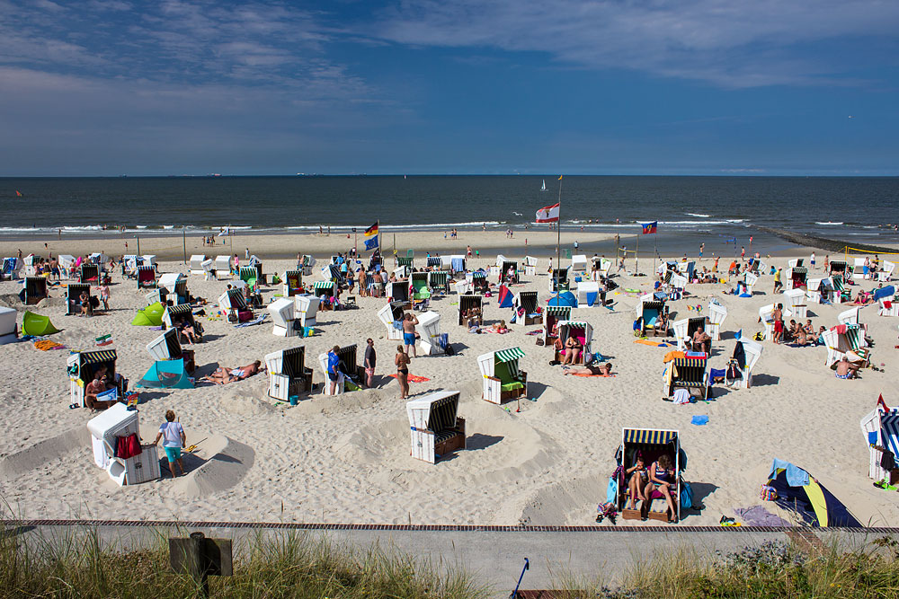Auf Wangerooge ist der Sandburgenbau weiterhin erlaubt, so lange man von außen nach innen gräbt. So langsam scheint es aber außer Mode zu geraden, Sandburgen zu bauen. Viele der Strandkörbe umgibt weder Wall noch Wassergraben.