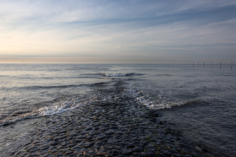 Bei Hochwasser sind die Seebuhnen zu großen Teilen überflutet, der Bildautor hat sich trotzdem auf die Buhne »N« gewagt und ist einige Meter in Richtung Norden gelaufen. Rechts sehen Sie die Begrenzung des Hauptbadefelds.