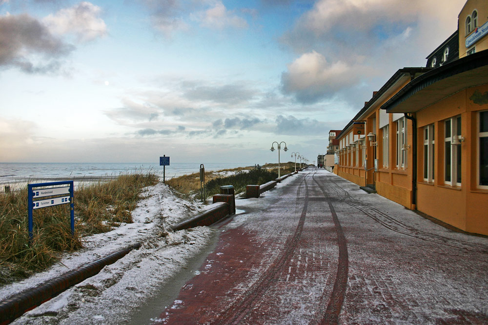 Ein kurzer Schneeschauer ist über die Insel hinweggezogen. Rechts ist das »Strandhotel Upstalsboom« erkennbar, links die Nordsee.