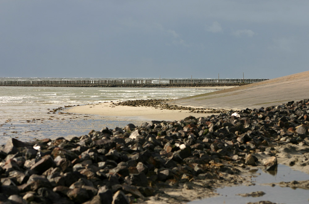 Im Vordergrund sehen Sie den Steindamm, der zum Schutz der »Harle Hörn«-Düne angelegt wurde. Er endet beim Südwestdeckwerk im Hintergrund.