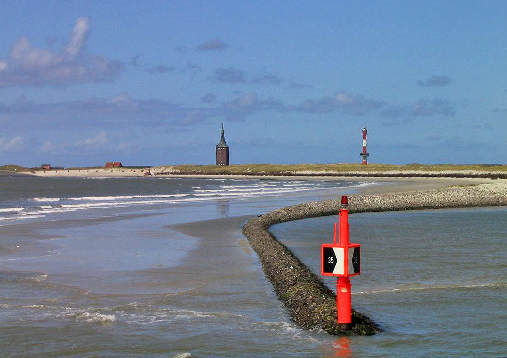 Auf diesem Foto sehen wir die Buhne »W«, die die Einfahrt in das nördliche Hafenbecken des Westanlegers markiert. Im Hintergrund sind Westturm, Neuer Leuchtturm und die noch recht intakten »Harle Hörn«-Dünen zu sehen.