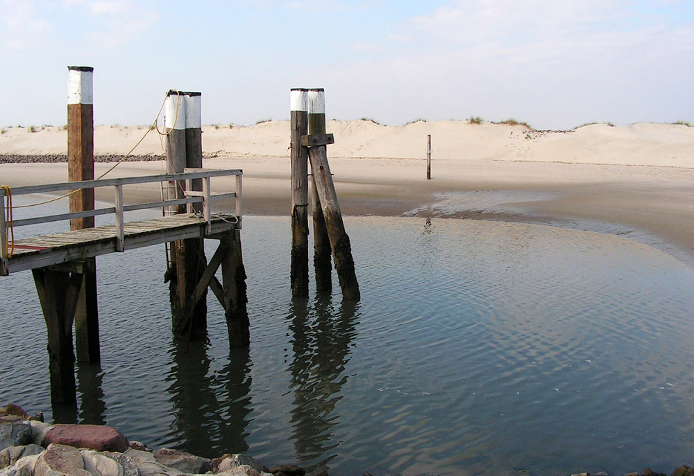 Anlegedalben im westlichen Hafenbecken des Anlegers. Momentan ist Niedrigwasser, der Spülsaum befindet sich weiter oben an den Dünen.