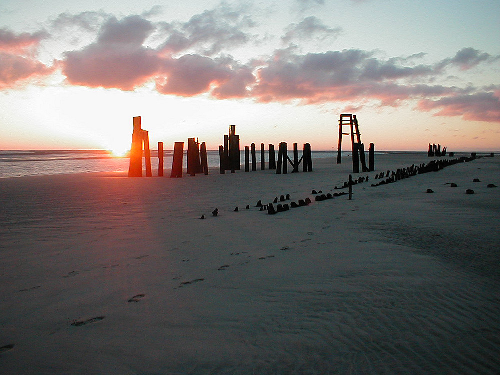 Im Gegenlicht der untergehenden Sonne betrachten wir einige alte Pfähle des ehemaligen Ostanlegers. Über ein halbes Jahrhundert ist der ständig versandende Anleger nun schon nicht mehr in Betrieb.