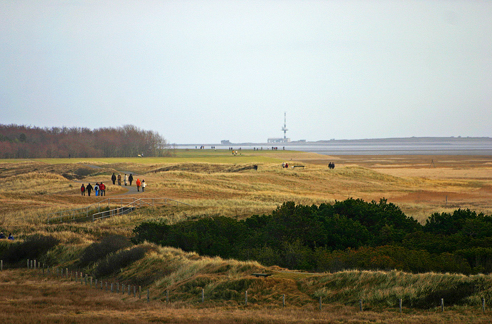 Von einer Dünenüberwegung aus blicken wir in Richtung Ostsüdost. Sowohl der alte Westgrodendeich (im Vordergrund) als auch der Dünendeich und der Dorfgrodendeich (beide von zahlreichen Personen bevölkert) sind zu erkennen, genau wie Wangerooges Nachbarinsel Minsener Oog mit dem Leuchtturm »Buhne C«.