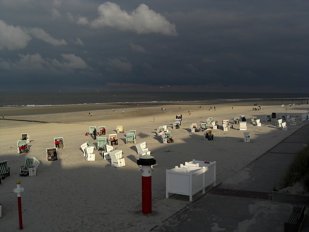 Bevor auch die letzten paar Strandkörbe ins Winterquartier wandern, machen es sich noch einmal zahlreiche Urlauber in der Abendsonne bequem und genießen die letzten Sonnenstrahlen des Tages, bevor gleich die herannahende Schlechtwetterfront herein zieht.