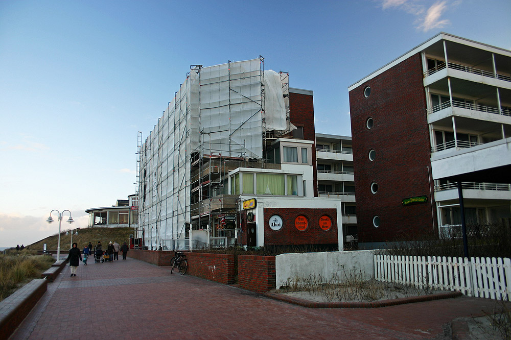 Die Fassade des Hauses »Monopol« wird, nachdem sie gelinde gesagt die beste Zeit hinter sich hatte, endlich komplett modernisiert. Also kein Christo auf Wangerooge, sondern nur einige Bauarbeiter.