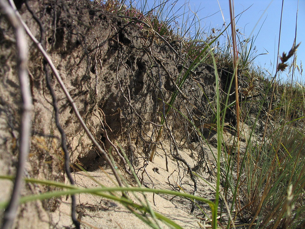 Dieser »steile Abhang« ist ein kleines, ca. 15 cm tiefes Erdloch, bei dem der Fotograf einmal die Makrofunktion seines Fotoapparates ausprobieren konnte. Zahlreiche Wurzeln des Dünengrases schauen aus dem sandigen Boden.