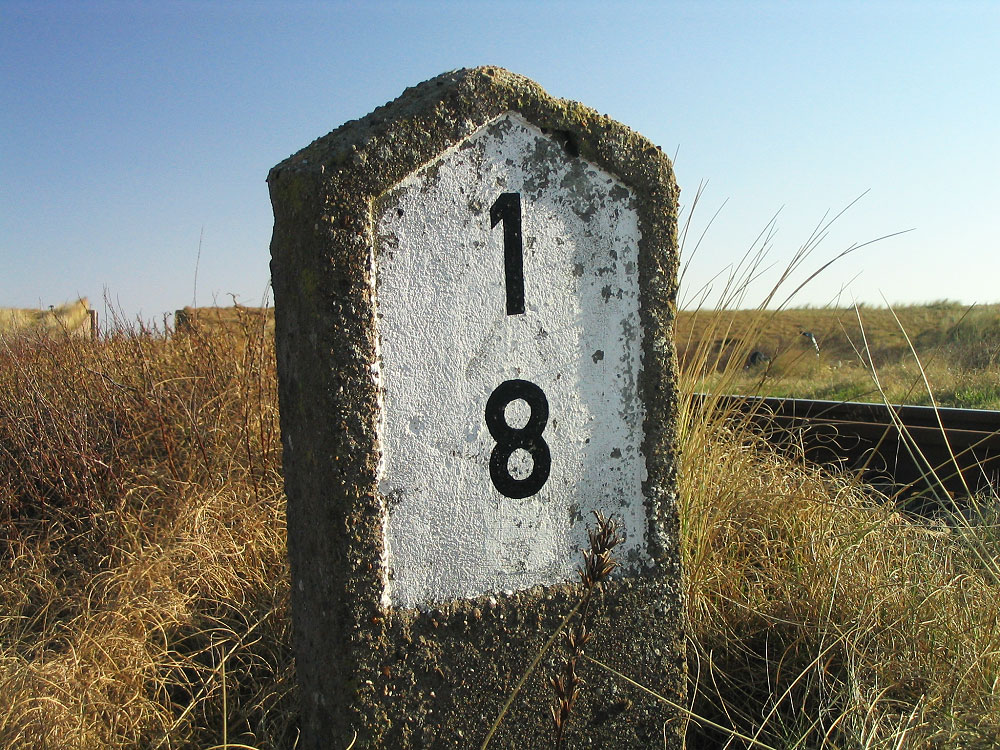 Noch von der »Großherzoglich-Oldenburgischen Eisenbahn« stammen diese Kilometersteine, hier beispielsweise der des Streckenkilometers 1,8.