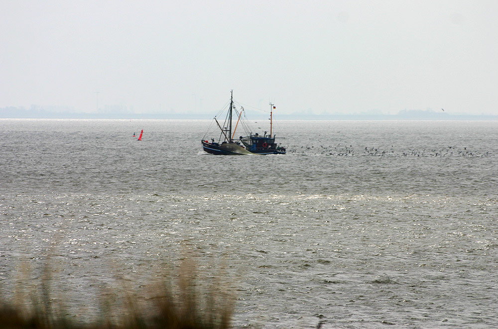 Vom Deckwerk aus betrachten wir einen Kutter, der momentan am Krabben fangen ist. Auf die Krabben, die dem Netz entkommen konnten, warten in der Hecksee schon die Möwen.