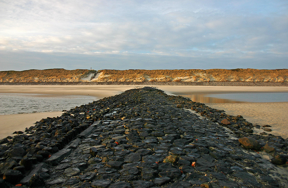 Seit wenigen Minuten erhellt die tiefstehende Morgensonne den Strand, die Buhne »K«, auf der wir gerade stehen und die Dünen im Hintergrund. Ebenfalls im Hintergrund befindet sich eine Überwegung – man kann dort zum Ehrenfriedhof bzw. zum »Slurpad« hinüber gehen (Slur = plattdeutsch für Pantoffel).