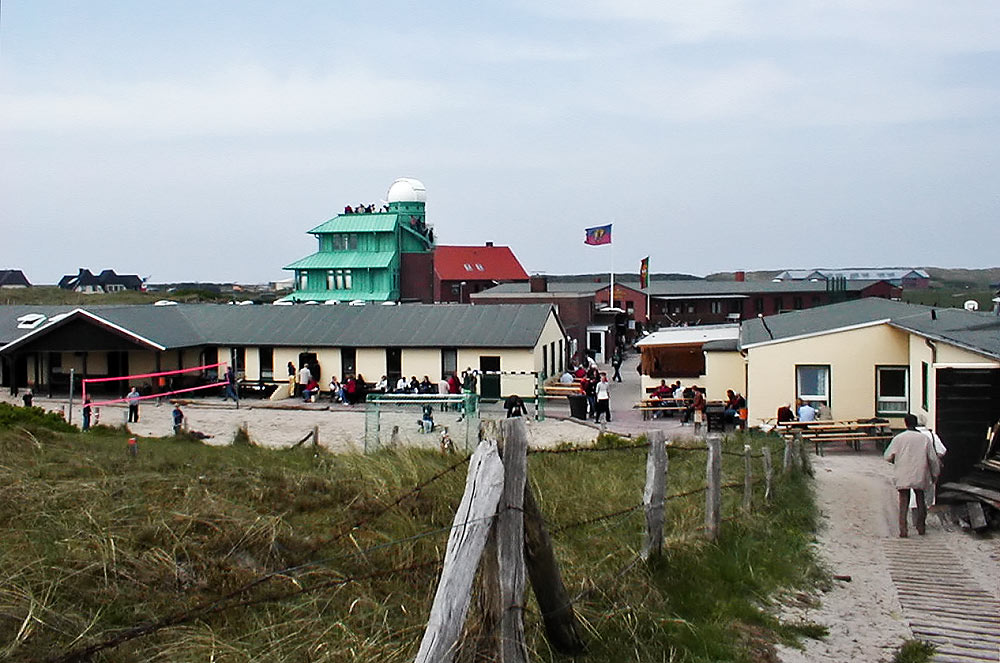 Das Grundstück vor uns gehört zum Schullandheim »Inselheim Rüstringen«: Der Steg, die beiden beigen Gebäude, der Volleyballplatz und selbstverständlich auch das Hauptgebäude mit Sternwarte.