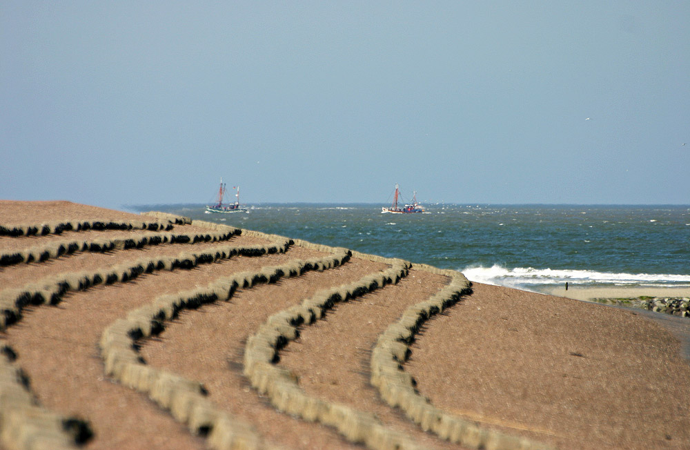 Im Vordergrund schlängelt sich das »Nordwestlängswerk« mit seinen Wellenbrechern entlang, während im Hintergrund zwei Harlesieler Krabbenkutter vorbeiziehen.