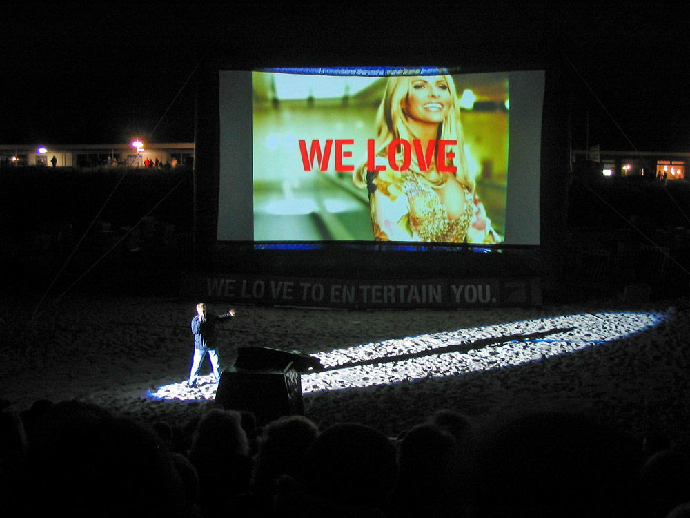 Während des Beach-Volleyball-Turniers im August 2005 hatte man am Wangerooger Hauptstrand die Möglichkeit, in Zusammenarbeit mit ProSieben einen Kinofilm zu schauen – natürlich kostenlos und draußen. Hierfür wurde auf dem Centre Court eine Leinwand aufgebaut, so daß man, auf der Tribüne sitzend, den Film bequem schauen konnte. Gezeigt wurde übrigens »Hitch – der Date Doktor«, ein sehr lustiger Film mit Will Smith und Eva Mendes. Noch ist aber der Moderator am »anheizen«.