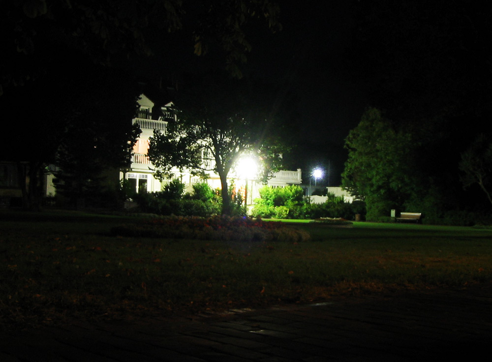 Die Springbrunnen sind zwar nachts abgestellt, doch die Blumenbeete und die gepflegte Rasenfläche des Dorfplatzes nahe des Alten Leuchtturms machen auch nachts einen guten Eindruck.