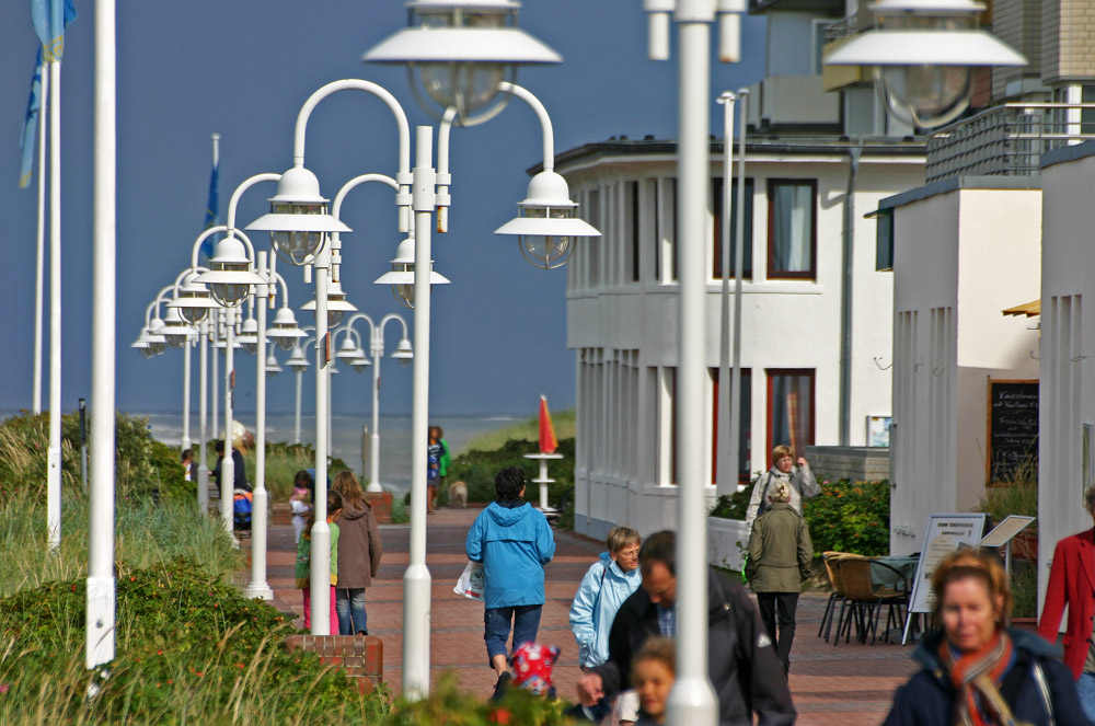 Beim Blick vom Pudding nach Osten sieht man in erster Linie Straßenlaternen. Durch das Teleobjektiv rücken sie noch näher aneinander, als ohnehin schon. Im Hintergrund ist das »Germania« zu sehen.