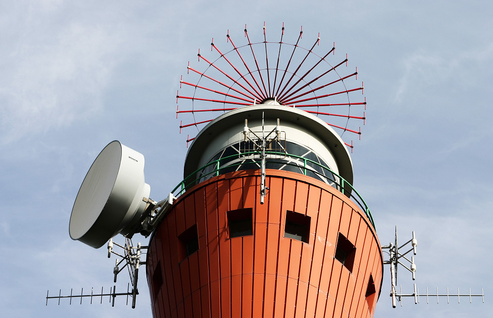 Einmal genauer zur Turmspitze hinaufgeblickt, sieht man erst, wie viele Antennen und sonstige Gerätschaften sich außen am Neuen Leuchtturm befinden.