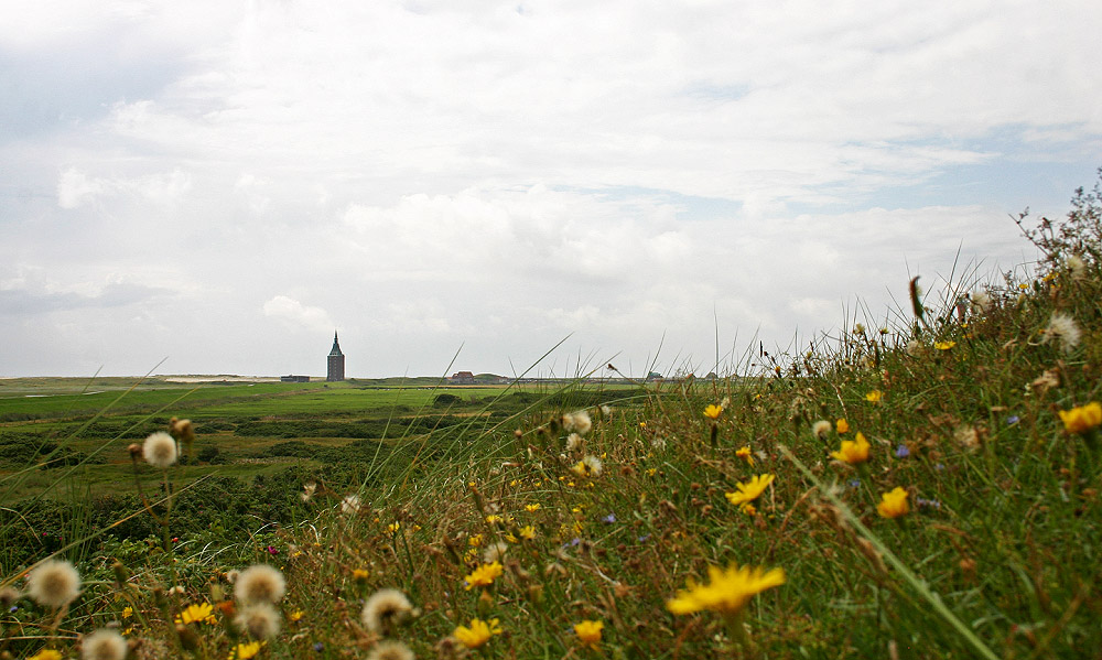 Eine typische Wildwiese befindet sich hier an der Düne – mit zahlreichen unterschiedlich blühenden Blumen. Man hat von hier aus einen schönen Blick über den Westinnengroden.