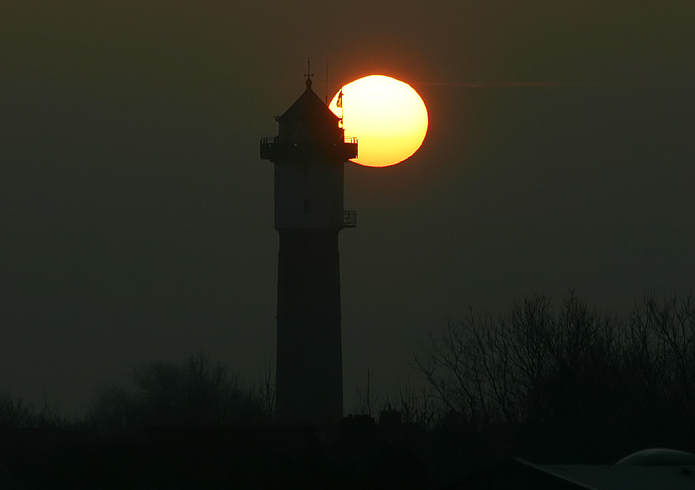 Als riesiger, orange-roter Ball erscheint die Morgensonne durch das Teleobjektiv. Davor hebt sich der Alte Leuchtturm ab, der auch an diesem Tag wieder von zahlreichen Touristen bestiegen werden wird.