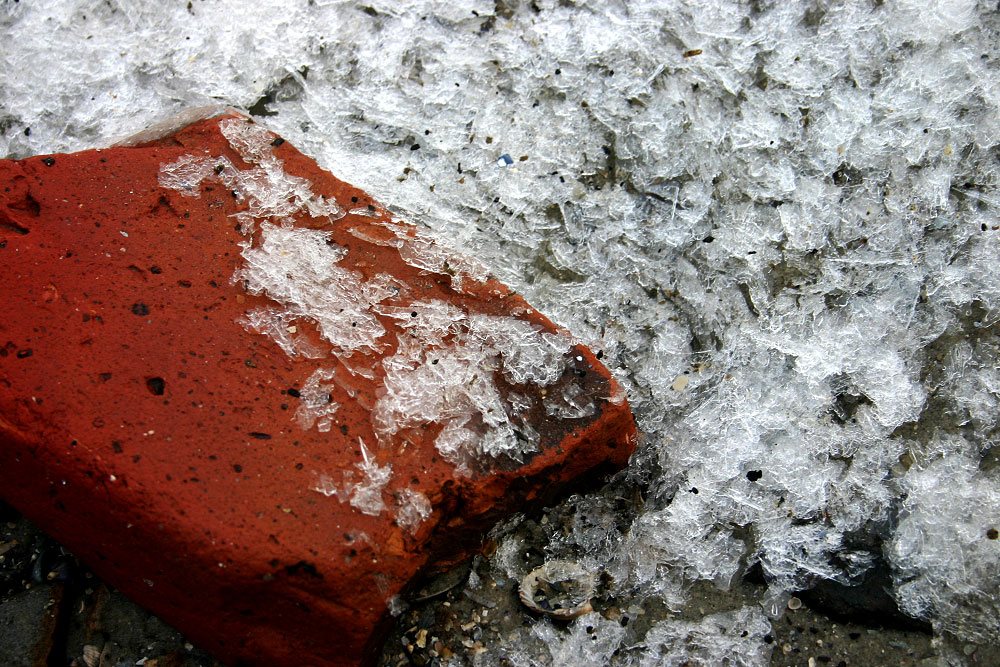 Gefrorenes Salzwasser hat eine ganz andere Struktur als Süßwasser, wie man hier auf und neben dem alten Klinkerstein (Von der Strandmauer? Oder doch aus dem Westdorf?) gut erkennen kann.