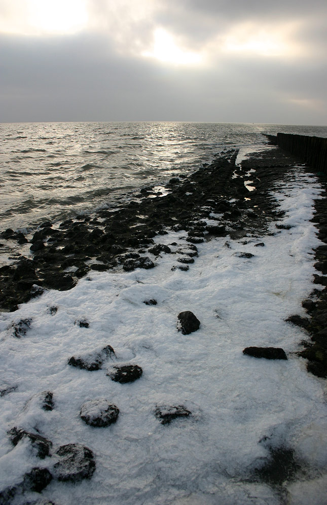 ‹ Die Brandung bei Hochwasser hat eine Menge Meereis auf die Basaltsteine und Pfähle geworfen. Dazu versucht die Sonne momentan, sich durch die dichten Wolken zu kämpfen, was leider heute bislang kaum gelang.