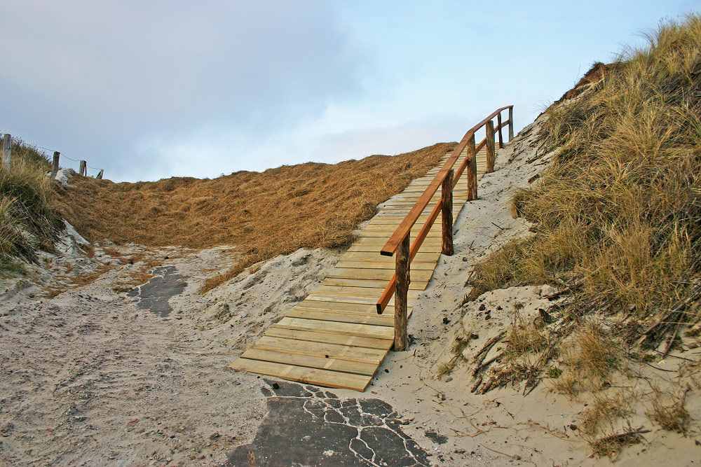 Hier sehen wir die erhöhte Dünenüberwegung nordwestlich des »Bünder Heims« noch einmal von der anderen Seite. Damit man sie leichter überqueren kann, besitzt sie an der Landseite sogar einen Steg mit Geländer.