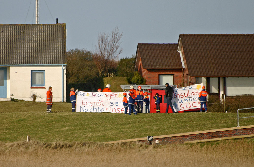 Mit zwei Bannern begrüßt die Wangerooger Jugendfeuerwehr die anläßlich des Insulanertreffens »Insulaner unner sück« eintreffenden Gäste. Folgender Spruch ist hier zu lesen: »Die JF Wangerooge begrüßt seine Nachbarinseln zu Insulaner unner sück«.