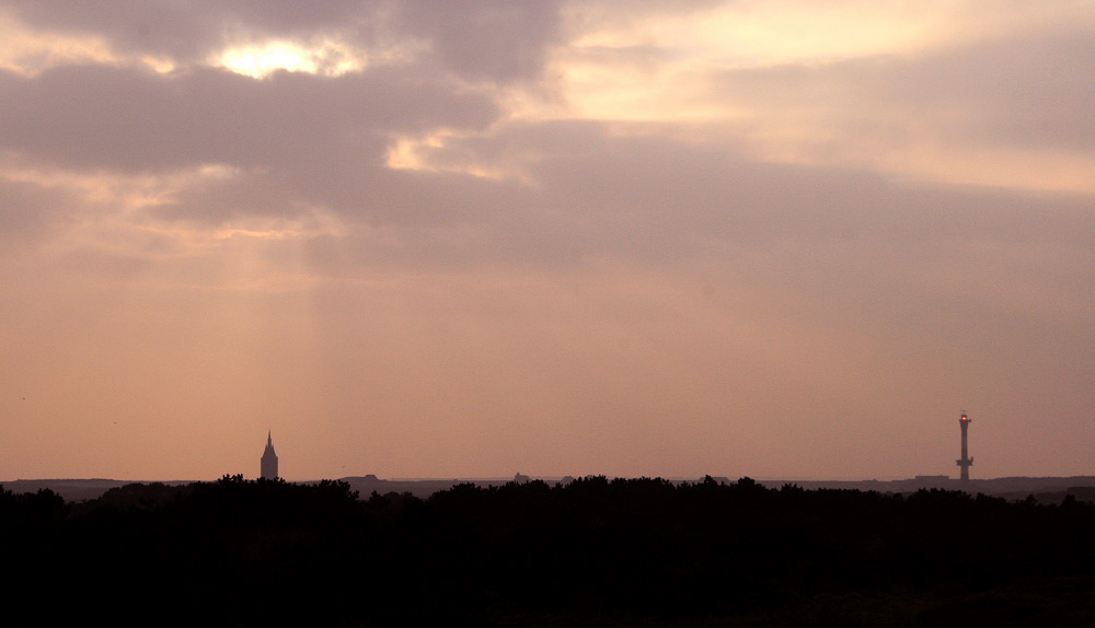 Auch wenn die Sonne von Wolken verdeckt ist, kann dies durchaus seine Reize haben, wie zum Beispiel die Sonnenstrahlen, die dann bei ganz leicht diesiger Luft zum Vorschein kommen. Darunter sehen wir die beiden Türme im Westen: Der Westturm ist in der linken Bildhälfte zu erkennen, während sich der Neue Leuchtturm – sogar im Moment des Leuchtens erwischt – weiter rechts vom Horizont abzeichnet.