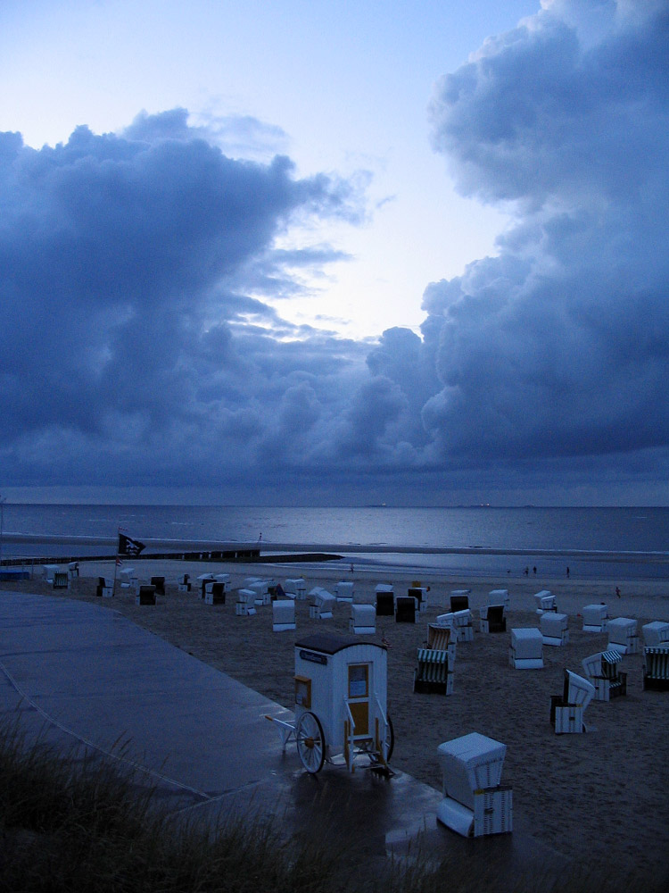‹ Zwischen hohen Wolkentürmen ist auch ein wenig klarer Himmel zu sehen, darunter die Westfeld-Badekarre, in der tagsüber der Strandwärter sitzt, wenn er nicht gerade unterwegs ist.