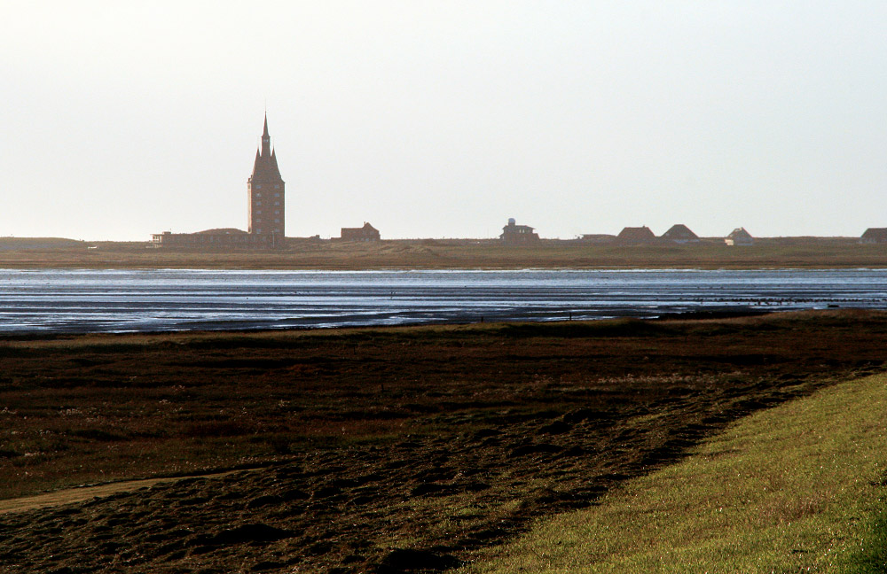 Über das Watt hinweg blicken wir zum Westturm, dem markanten Wahrzeichen von Wangerooge. Einige weitere Gebäude des Westdorfes sieht man ebenfalls noch, so wie beispielsweise das Inselheim Rüstringen mit Sternwarte.