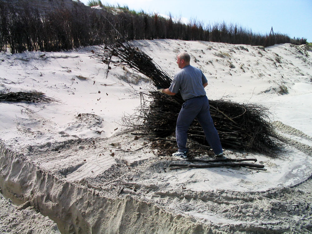 Die Laubholzfaschinen werden nun vor den soeben ausgehobenen Graben gelegt, um danach aufrecht gesetzt zu werden. Etwas weiter oben sehen Sie einen solchen Buschzaun, der dort allerdings als Zaunersatz für die Dünenüberwegung dienen soll.
