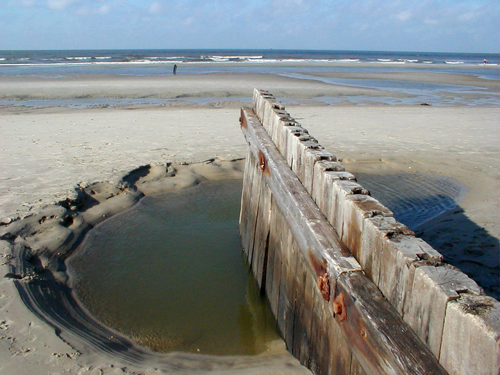Die Pfahlbuhne »T« ist auf diesem Foto noch in ihrem ursprünglichen Zustand von 1937 zu sehen. Heutzutage ist sie um einiges verlängert worden und besitzt sogar an einer Stelle eine steinerne Überwegungsmöglichkeit für Fahrzeuge.