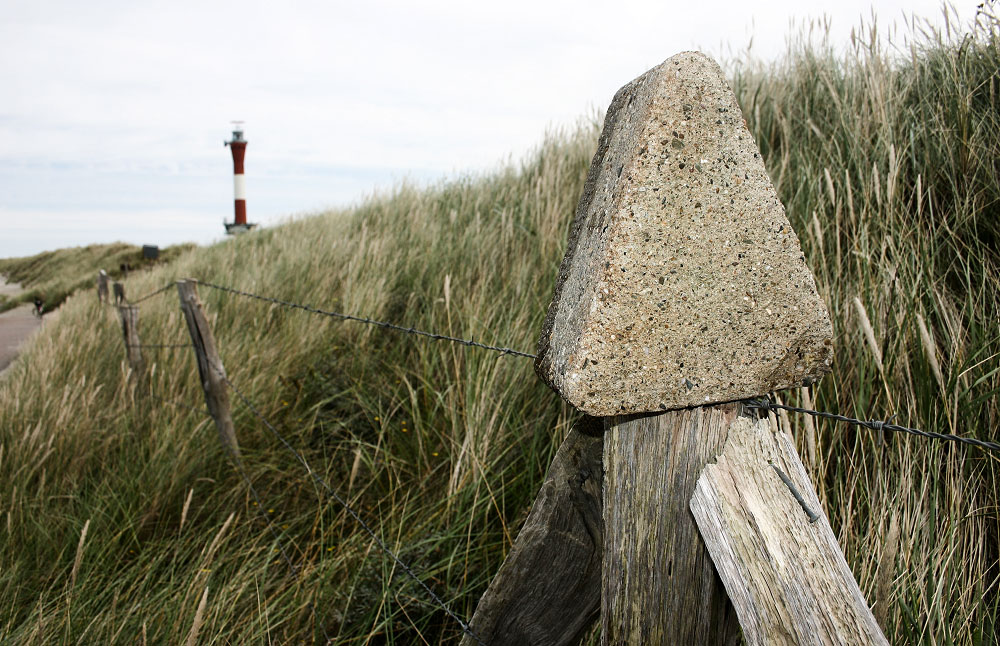Einige der dreieckigen Deckwerkssteine aus Beton haben sich gelöst und liegen lose herum. Dieser Stein wurde auf einen der Zaunpfähle gestellt. Falls man es hinbekommt, dies als moderne Kunst zu vermarkten, ist man ein wahrer Profi.