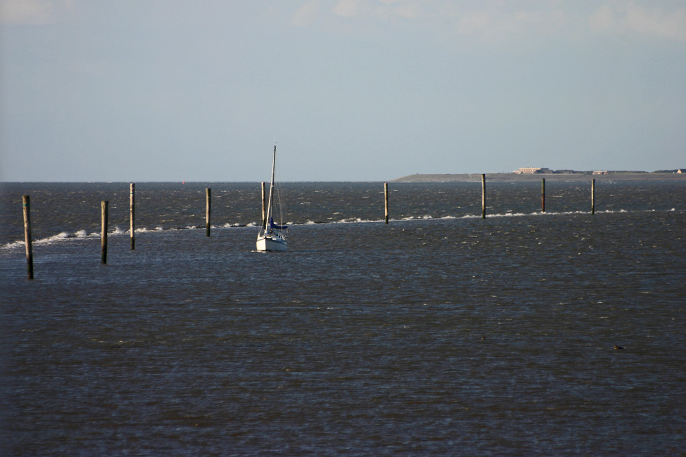 Der Steindamm, in dem sich das Segelboot befindet, gehört noch zum Festland, das Deckwerk im Hintergrund dagegen schon zur Insel.