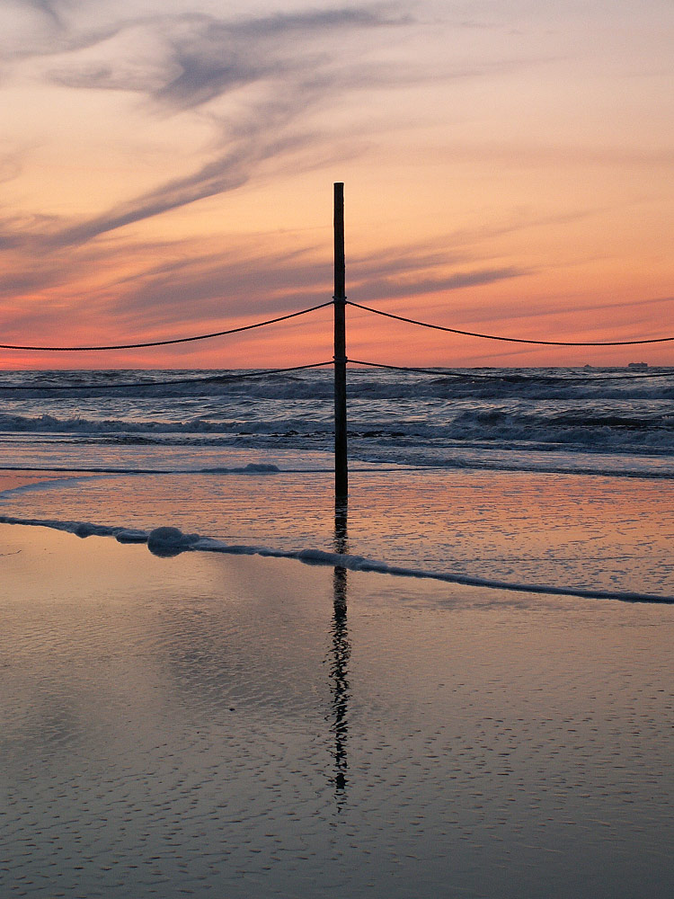 ‹ Diese Pfähle mit den Seilen dran markiern die Begrenzung der Badefelder auf Wangerooge, in diesem Falle die Westseite des Hauptbades.