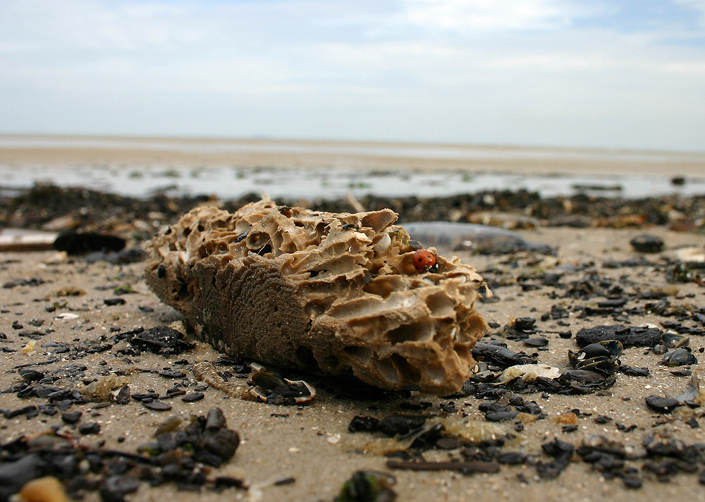 Ein kleiner Marienkäfer verkriecht sich auf einem Stück Treibgut. Im Sommer 2009 gab es unzählige dieser kleinen Käfer an der Küste.