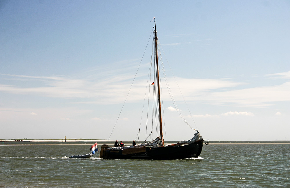 Ein typisches Plattbodenschiff aus den Niederlanden fährt hier zwischen Wangerooge und Minsener Oog (im Hintergrund) an uns vorbei. Durch die Form des Bodens liegt es bei Niedrigwasser vollkommen gerade auf dem Wattboden auf; die Seitenschwerter an den Seiten erleichtern den Kurs zu halten, wenn sie denn ausgeklappt sind.