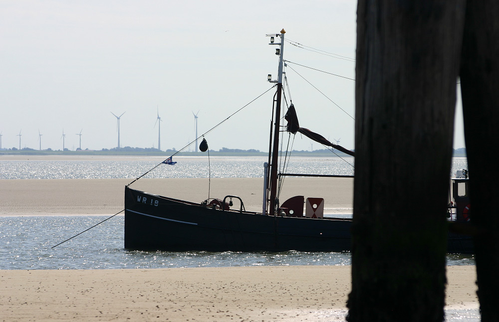 Im »Wangerooger Fahrwasser« liegt ein niederländisches Schiff vor Anker. An der Form des Bugs kann man erkennen, daß es schon viele, viele Jahre auf dem Buckel haben dürfte.
