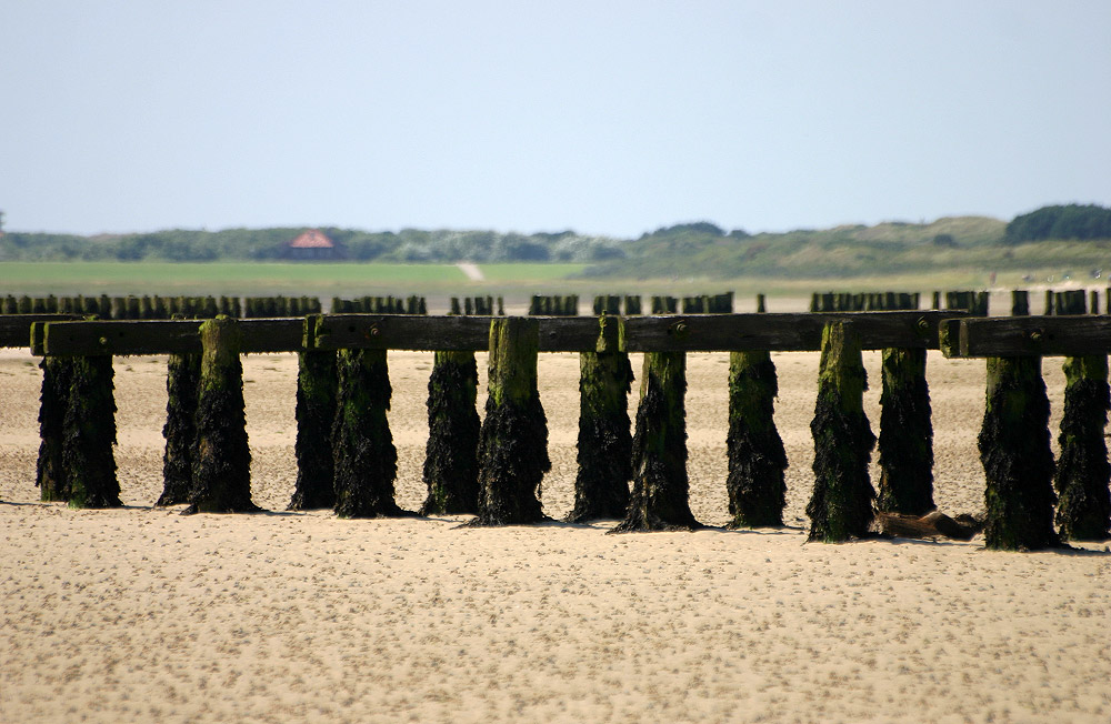 Die Gleise der Inselbahn verliefen hier kurz vor dem Ostanleger auf Pfählen; zahlreiche dieser Pfähle tragen sogar noch die alten Bahnschwellen. Im Hintergrund sehen Sie den Ostgrodendeich, Höhe »Neudeich«.