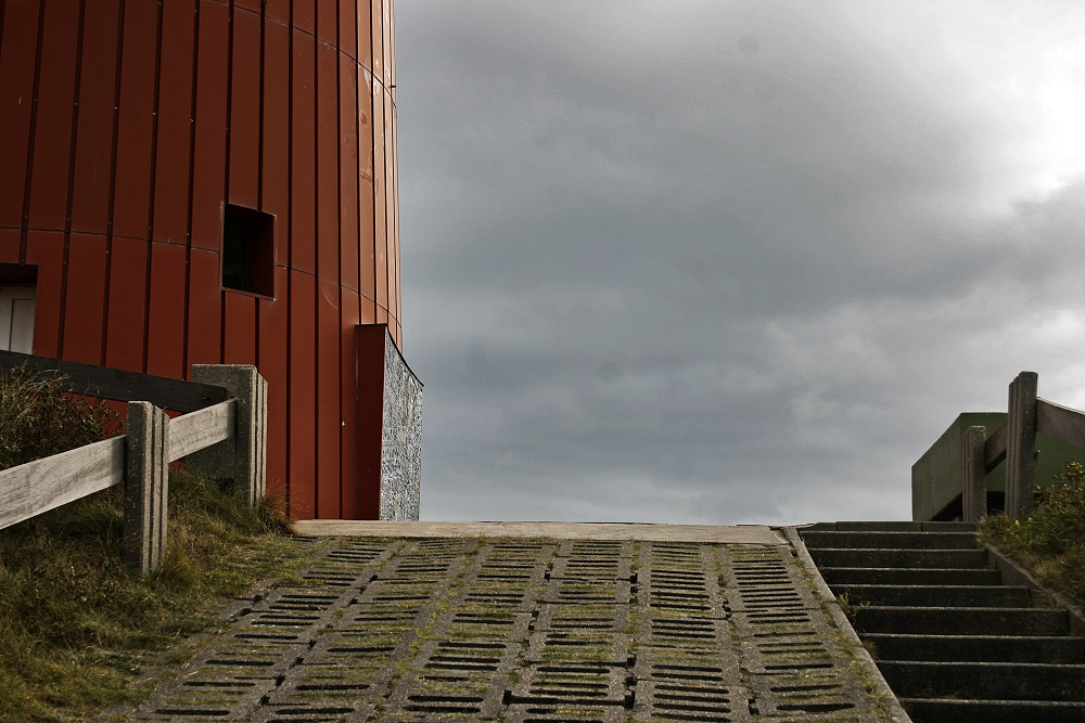 Die Treppe führt hoch zum Fuße des Neuen Leuchtturms (links im Bild). Unten an der Turmwand befindet sich eine Keramik-Bildwand, die die Leuchtfeuer und Schiffahrtswege der Deutschen Bucht zeigt.