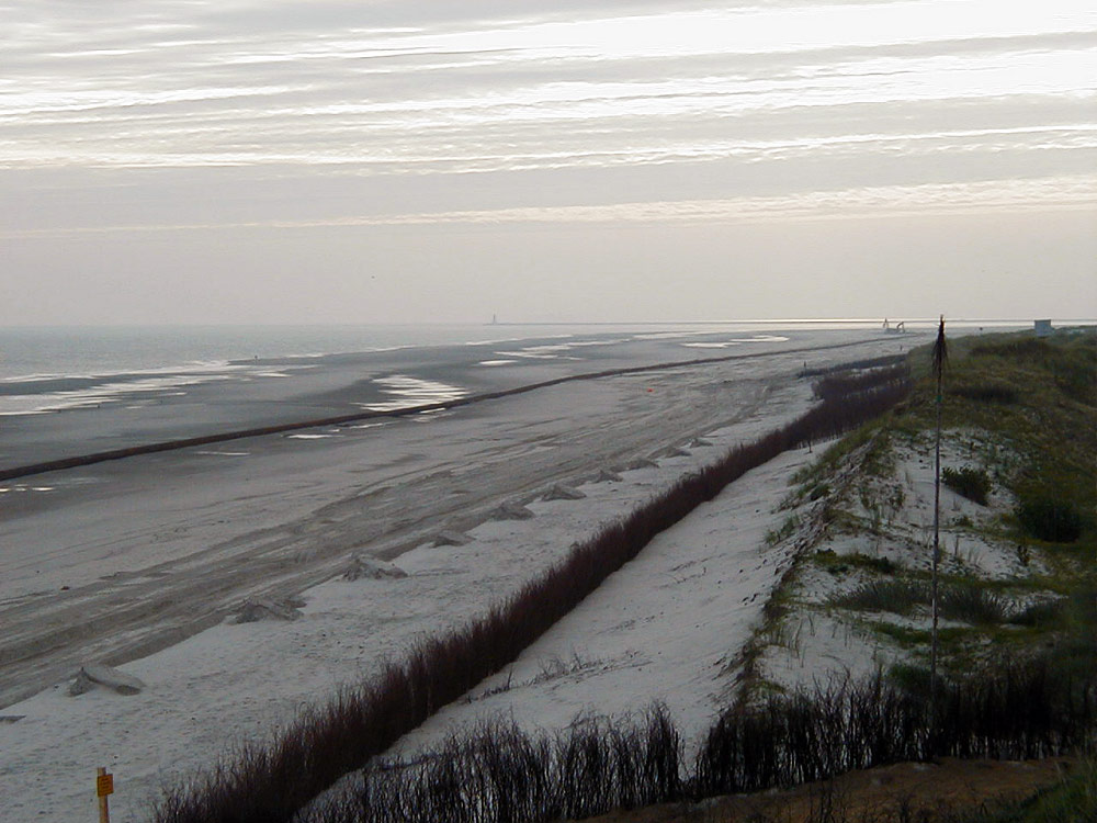 Anhand der »Haufen« kann man noch gut erkennen, wo die Spülleitung vorher lag. Sie wurde nun schon ein ganzes Stück Richtung Wasserkante (bei Niedrigwasser) verbracht. Die Baufirma ist zum Aufnahmezeitpunkt hinten im Osten tätig, wie man an den Baggern erkennen kann.