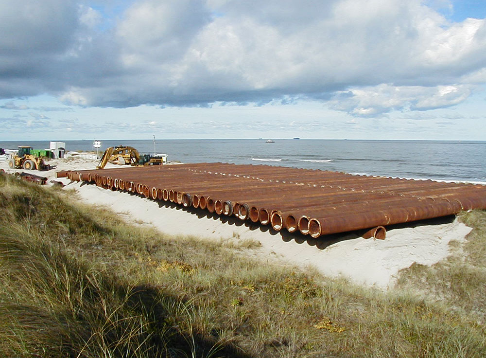 Hier noch ein Foto vom Rohrlager an der Dünenüberwegung »Neudeich«, diesmal aus anderer Perspektive. Sobald die Dükerleitung wieder liegt, werden auch diese Spülrohre am Strand verlegt.