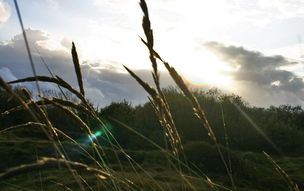 Noch ist die Sonne zu sehen, doch die nächsten Wolken kommen bereits und bringen auch wieder neuen Regen. Dabei ist das Gras noch ganz naß.
