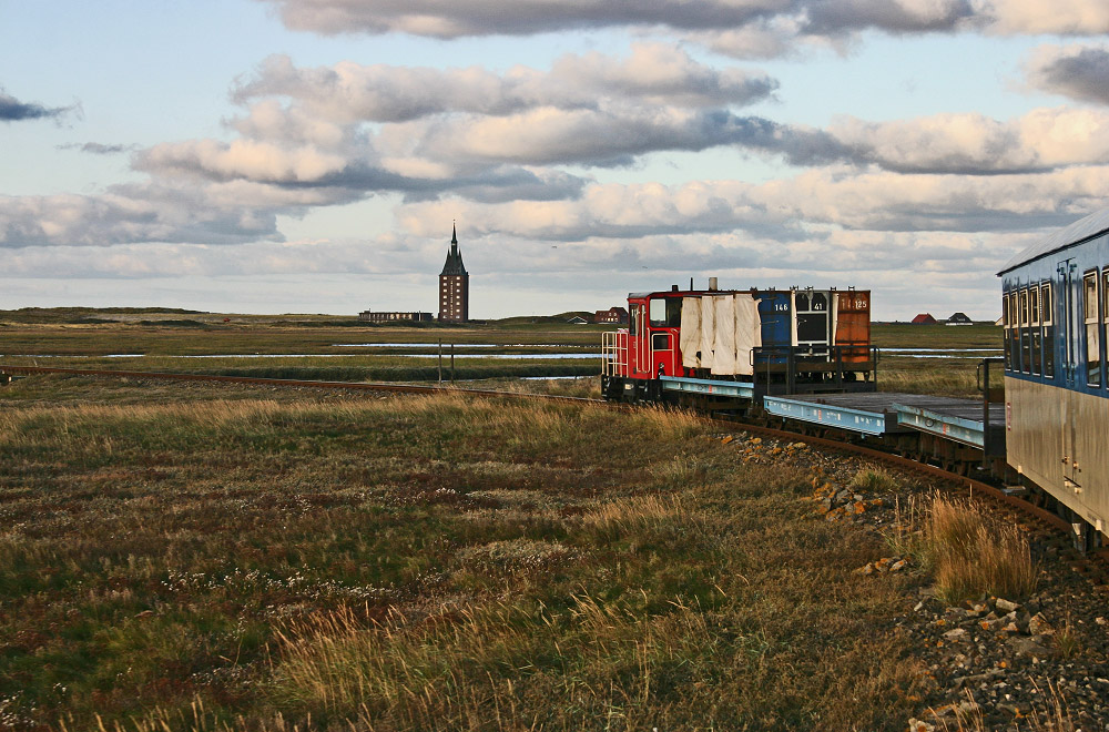Die Strecke der Inselbahn verläuft in einem großen Bogen um die »Salinebucht« herum. An dieser Stelle macht sie daher eine Linkskurve, so daß man auf die Lok und die Flachwagen blicken kann.