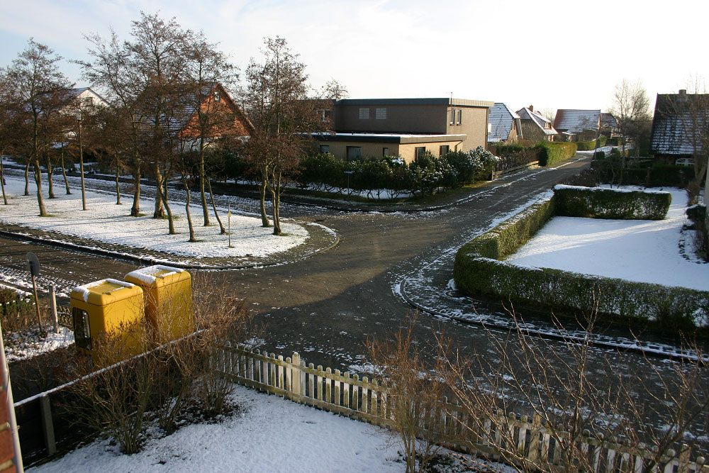 Wir blicken vom Balkonfenster auf die Kreuzung im »Dorfgroden«, an die auch eine Art Verkehrsinsel angrenzt (links im Bild).