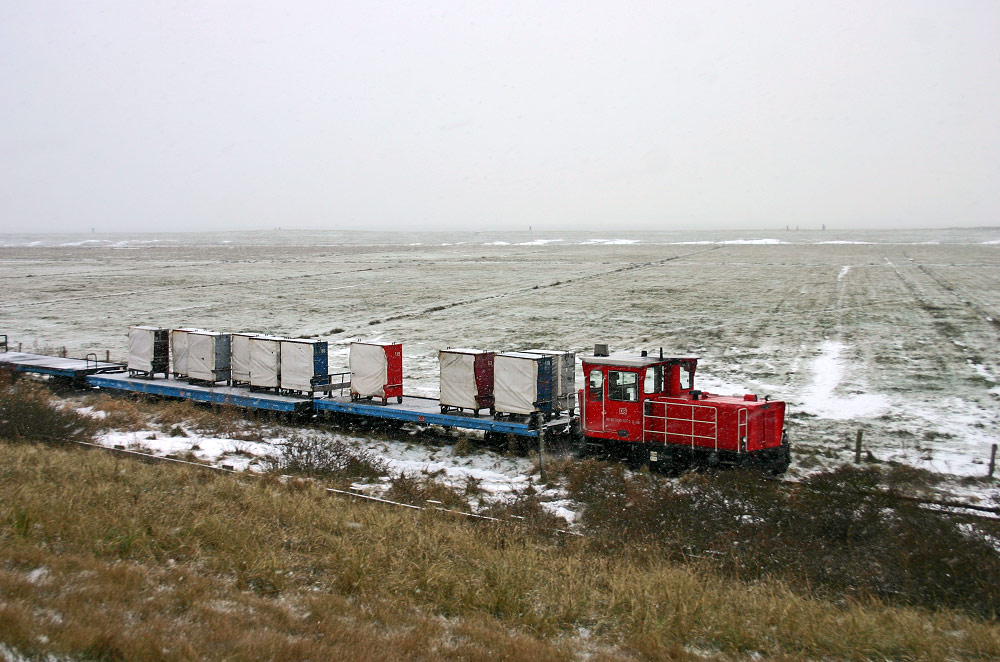 Hier noch einmal die Inselbahn, die an uns vorbeirauscht (mit 20 km/h). Ganze zehn Gepäckcontainer sind geladen, ob diese alle voll sind, ist natürlich eine andere Frage.