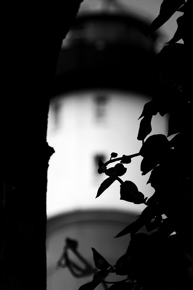 ‹ Der Alte Leuchtturm versteckt sich, zumindest für den Betrachter, zum Teil hinter Blättern und einem Baumstumpf.